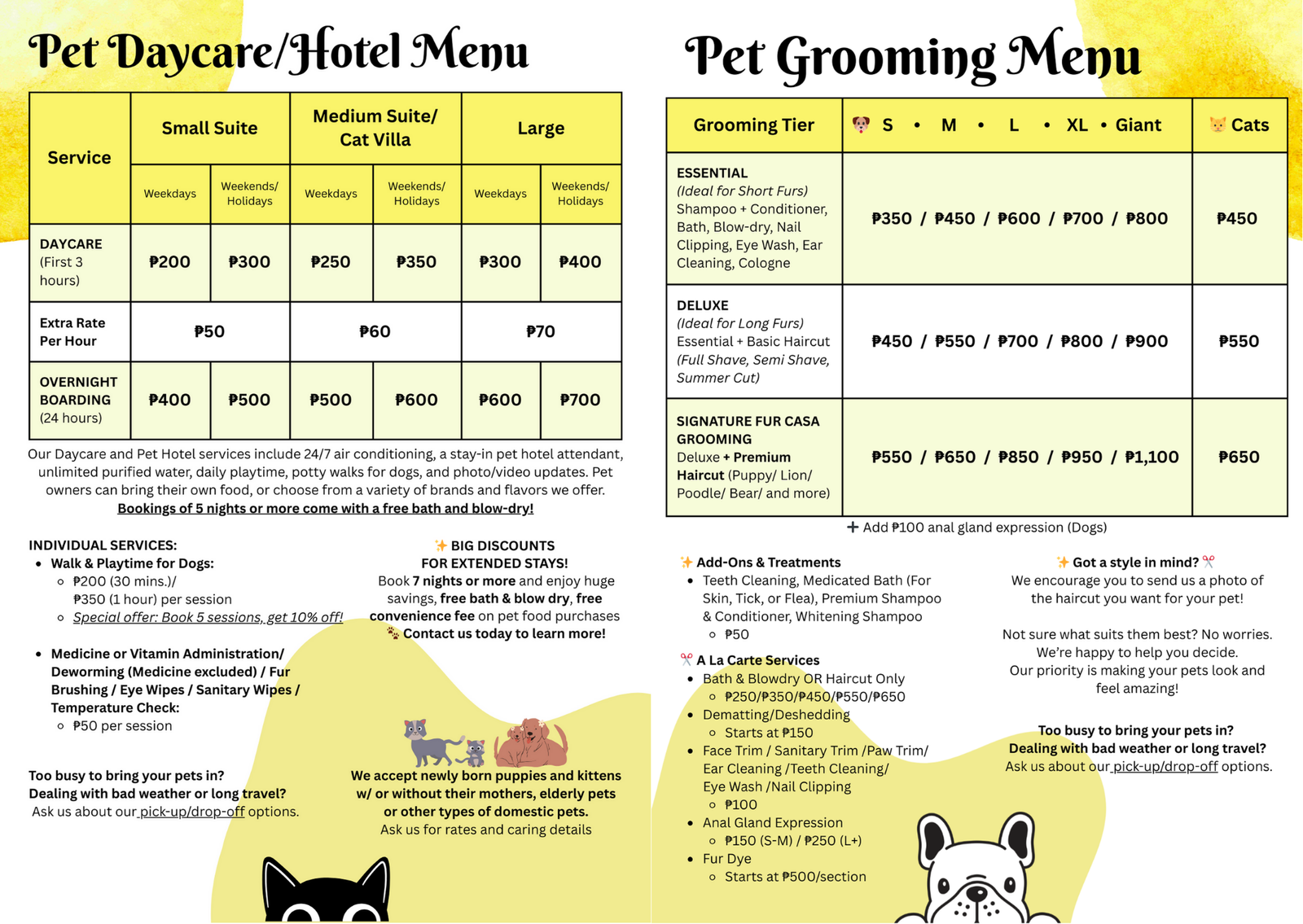 - Walk & Playtime for Dogs – ₱100 (30 mins) / ₱200 (1 hour)